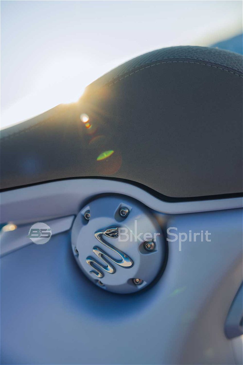 Με σχεδίαση εμπνευσμένη από τα παγωμένα τοπία και την αιθέρια ομορφιά του χειμώνα, η Vespa 946 Snake ξεχωρίζει με το ιριδίζον μπλε χρώμα της σε παγωμένες αποχρώσεις που υμνεί την καθαρότητα και τη δύναμη των χιονισμένων τοπίων. Σε αυτή την αρμονική συγχώνευση κομψότητας και παγετώδους τοπίου προστίθεται η έμπνευση του φιδιού, το οποίο βρίσκει έκφραση στις χειρολαβές και τη σέλα, με επένδυση που θυμίζει την απαλή υφή του δέρματος του ζώου. Το επιχρωμιωμένο φίδι, που εμφανίζεται στην τάπα του ρεζερβουάρ και το μπροστινό φτερό, ολοκληρώνει ένα σχεδιαστικό έργο που συνδυάζει δύναμη, χάρη και πρωτοτυπία.
