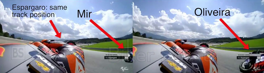 Το βίντεο δείχνει πώς ο Pol Espargaró έχει την ίδια γραμμή στον 7ο γύρο πριν από το συμβάν, όπως και στον 8ο γύρο, οπού έπεσε. Και οι δύο γύροι δείχνουν πώς ο Espargaro οδηγεί ανοικτά, από αυτή που είναι η «συνηθισμένη» γραμμή, ωστόσο, η μεγάλη διαφορά μεταξύ του γύρου επτά και οκτώ είναι ο αντίπαλός του. Στο έβδομο γύρο , ο Joan Mir εκμεταλλεύτηκε το κενό που άφησε το KTM για να τον προσπεράσει, από την εσωτερική γραμμή, χωρίς κανένα πρόβλημα. Στο όγδοο, όμως, ο Miguel Oliveira προσπερνά ανοικτά με αποτέλεσμα να έχουν επαφή και να πέφτουν και οι δυο αναβάτες. Αυτό το περιστατικό πρέπει η επιτροπή της FIM να κρίνει και να αποδώσει ευθύνες αν τυχόν υπάρχουν.