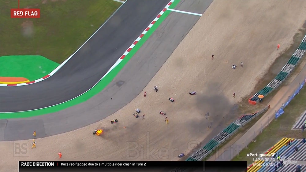Ο αγώνας της Moto2 διακόπηκε στον ένατο γύρο μετά από ένα ατύχημα στο οποίο ενεπλάκησαν 12 αναβάτες, συμπεριλαμβανομένων των τριών πρώτων στον αγώνα εκείνη τη στιγμή λόγω της ξαφνικής βροχής.