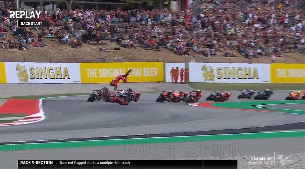 Ο αγώνας στην Catalunya ξεκίνησε με τον χειρότερο τρόπο που θα μπορούσε αφού είχαμε δυο συνεχόμενα τρομακτικά περιστατικά στις πρώτες στροφές του αγώνα που ανάγκασαν την κόκκινή σημαία να βγει και να διακοπεί ο αγώνας!