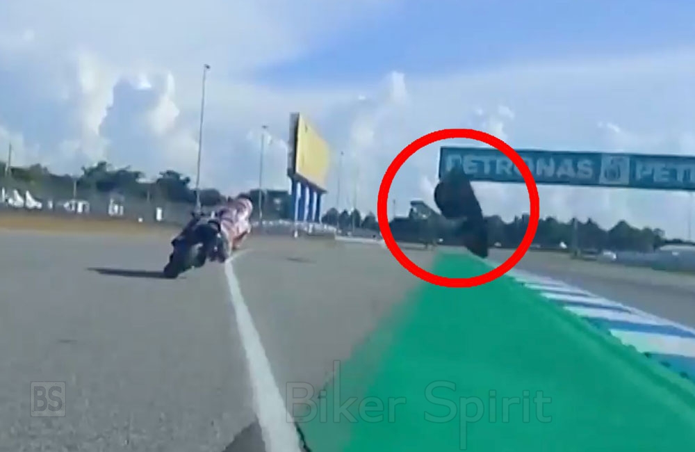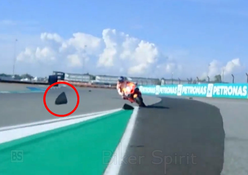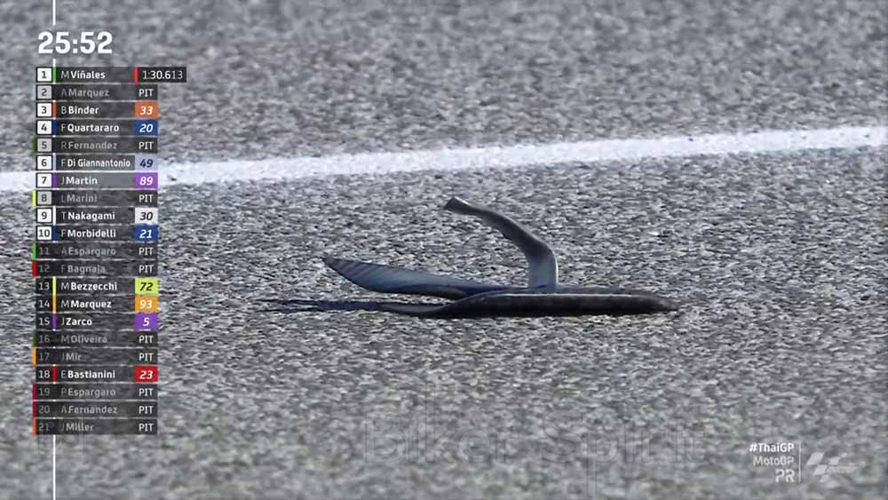 Στη συνέχεια, το φτερό του μπροστινού τροχού από την μοτοσυκλέτα της Pramac πέταξε και χτύπησε τον Marquez.