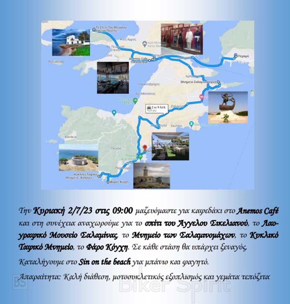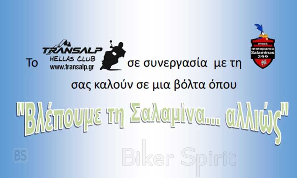 Επειδή μοτοσυκλετισμός δεν είναι μόνο βόλτες και καλοπέραση, το Hellas Transalp Club και η Motoparea Salaminas (299), την Κυριακή 2/7 διοργανώνουν την εκδήλωση «Βλέποντας τη Σαλαμίνα…αλλιώς» στη διάρκεια της οποίας οι συμμετέχοντες θα γνωρίσουν από κοντά την ιστορία αυτού του νησιού και θα ενημερωθούν από έμπειρους ξεναγούς.