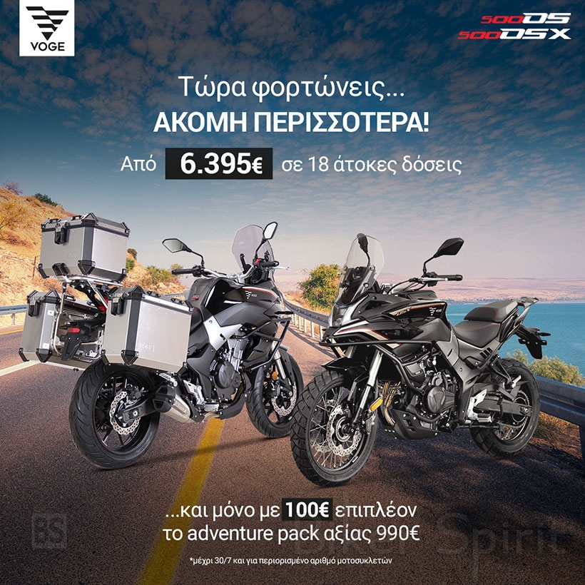 Και τώρα, ενόψει καλοκαιρινών διακοπών, η αντιπροσωπεία προχωράει σε μια μοναδική προσφορά προς όλους τους νέους ιδιοκτήτες των μοντέλων 500DS & 500DSX. Όσοι λοιπόν κάνουν δικό τους τώρα ένα από αυτά τα μοντέλα, έχουν τη δυνατότητα να αποκτήσουν μαζί και το Adventurepack της Voge, αποτελούμενοαπό τρεις εργοστασιακές αλουμινένιες βαλίτσες μαζί με τις βάσεις στήριξηςστην απίστευτη τιμή των μόλις 100€ (από 990€)! Mε συνολική χωρητικότητα 107 λίτρων, το μόνο σίγουρο είναι πωςθα καλύψει απόλυτα τις εκδρομικές ανάγκες αναβάτη και συνεπιβάτη.