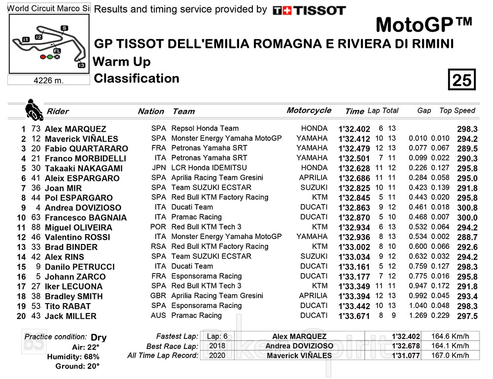Ο αναβάτης της Repsol Honda Team σταμάτησε το χρονόμετρο στο 1:32.402 και τέλειωσε την πρωινή προθέρμανση μπροστά από τις τρεις Yamaha, αυτή του pole-man, Maverick Vinales και των Fabio Quartararo και Franco Morbidelli.
