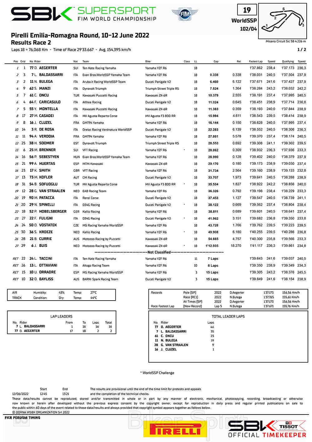 Ο Aegerter αφού πέρασε τον Yari Montella (Kawasaki Puccetti Racing) στη στροφή 4 στον 5ο γύρο ανέβηκε στη δεύτερη θέση. Μετά από αυτό, έμεινε πίσω από τον Baldassarri και ξεκίνησε τις επιθέσεις και τις προσπεράσεις. Στον 17ο γύρο από τους 18, ο Aegerter έκανε την κίνησή του στη στροφή 11 και πέρασε στην πρώτη θέση και πάλι και έμεινε μέχρι την καρό σημαία και έτσι κέρδισε την έβδομη συνεχόμενη νίκη του στο WorldSSP και έγινε ο πρώτος αναβάτης που έχει τουλάχιστον επτά νίκες σε δύο διαφορετικές σεζόν, έχοντας πάρει 10νικες το 2021. Ήταν επίσης η 125η νίκη της Yamaha στην κατηγορία και το 33ο βάθρο τους.