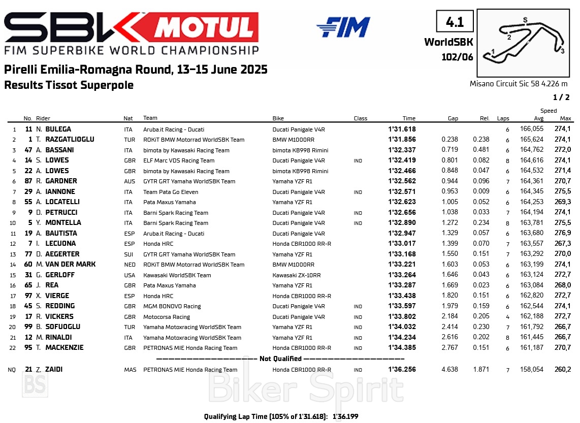 Superpole στο Misano: Ο Bulega έκανε ρεκόρ πίστας για την pole position, αλλά είναι υπό διερεύνηση λόγω συμβαντος στην πίστα. Ιστορική πρώτη σειρά για την Bimota από το 1989!