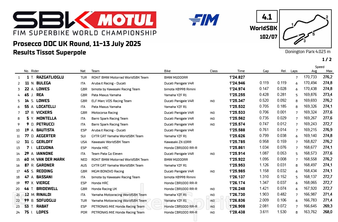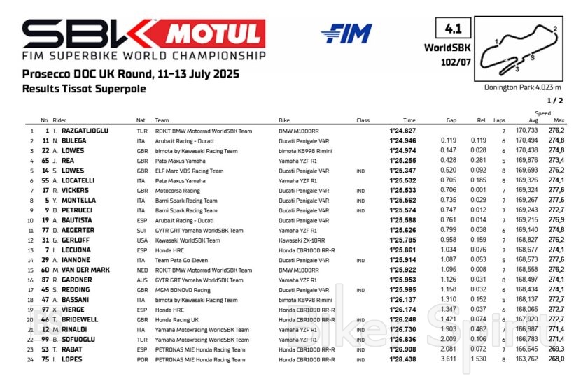Ο Bulega κατάφερε να σπάσει το φράγμα του 1’24 με χρόνο 1’24.946s και ανέβηκε προσωρινά στην πρώτη θέση. Ωστόσο, η αδυναμία του στις στροφές του τρίτου τομέα άφησε το πεδίο ανοιχτό για τον Razgatlioglu να τον περάσει και να κατακτήσει την pole. Με χρόνο 1’24.827s.