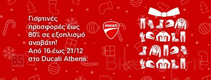 Το Ducati Athens διοργανώνει ένα πενθήμερο εορταστικό Bazaar εν όψει των Χριστουγέννων και της Πρωτοχρονιάς. Κράνη, μπουφάν, μπότες, γάντια αλλά και επιλεγμένα Ducati accessories, διατίθενται με έκπτωση έως 80%, πάντα με την εγγύηση γνησιότητας Ducati.