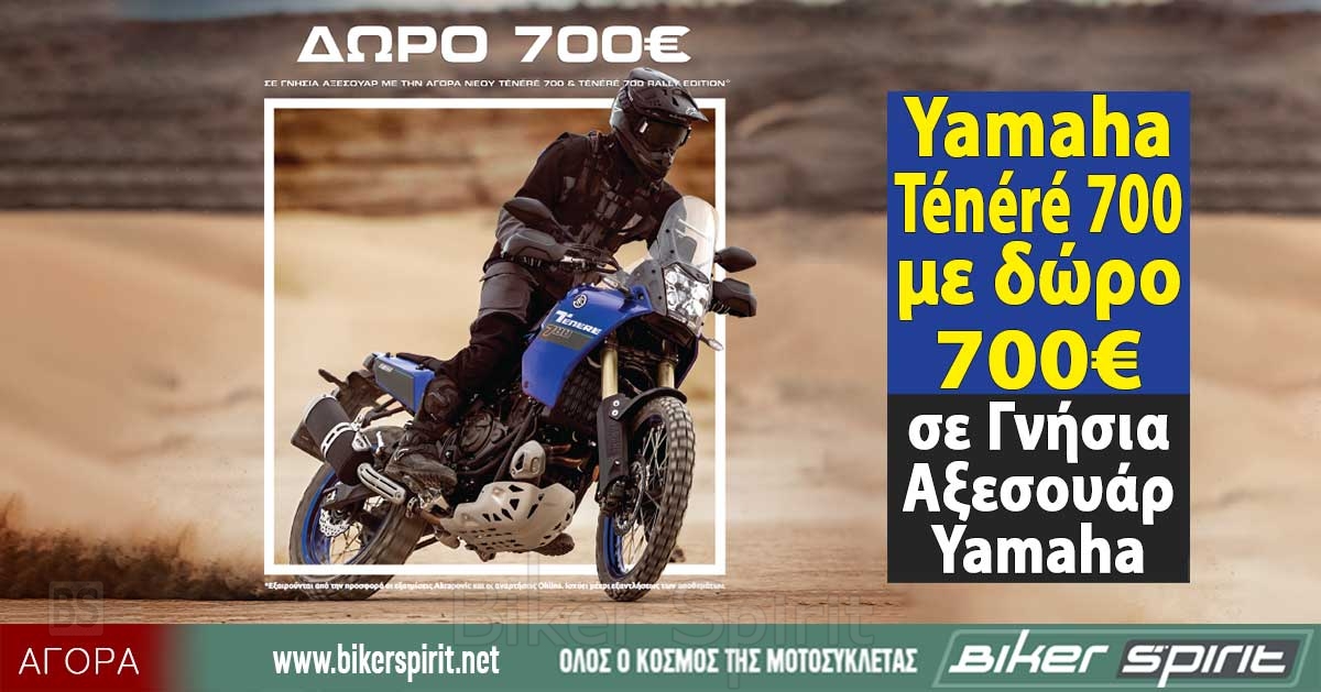 H Ténéré 700 συνεχίζει τις εκπλήξεις! Ακολουθώντας την επιτυχία της εορταστικής προσφοράς που ίσχυε για τα 40 χρόνια Ténéré, η Yamaha ανανεώνει και αυξάνει το δώρο σε Γνήσια Αξεσουάρ Yamaha στα 700€, με την απόκτηση των μοντέλων Ténéré 700 και Ténéré 700 Rally Edition!