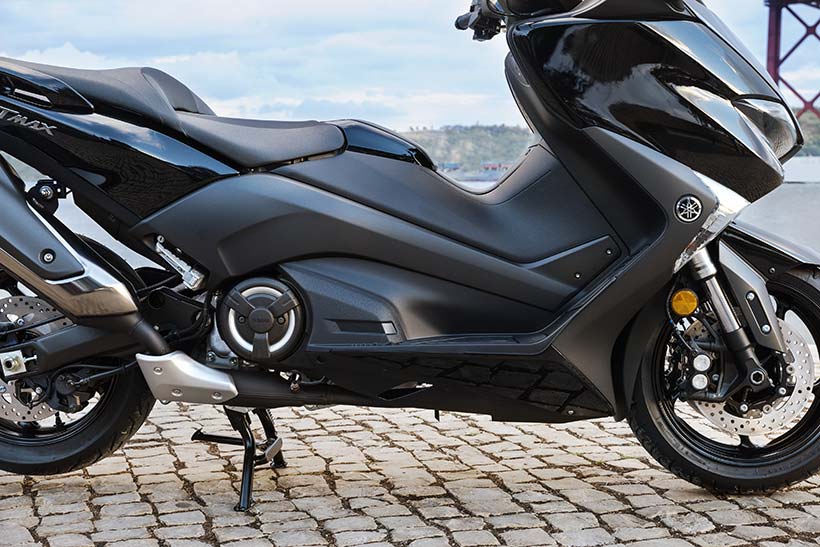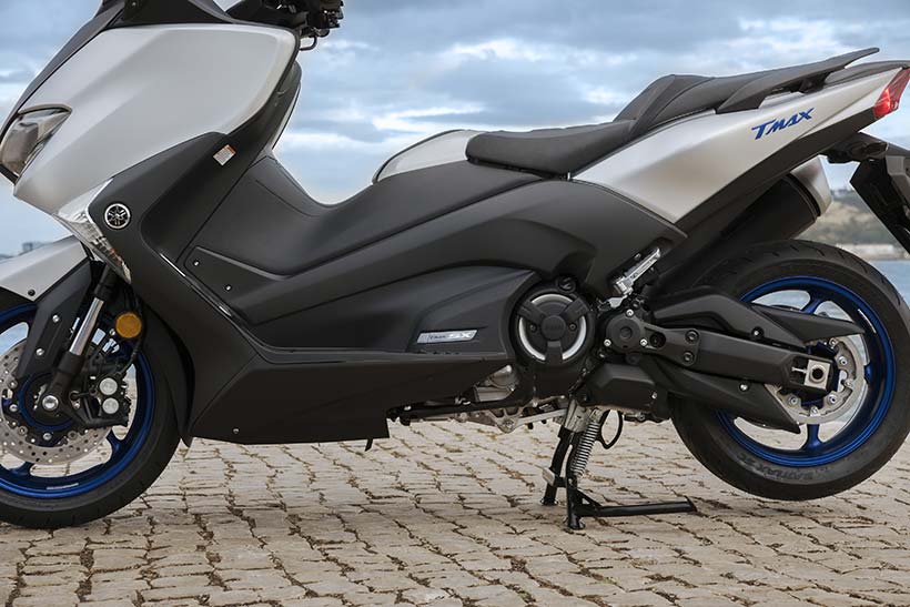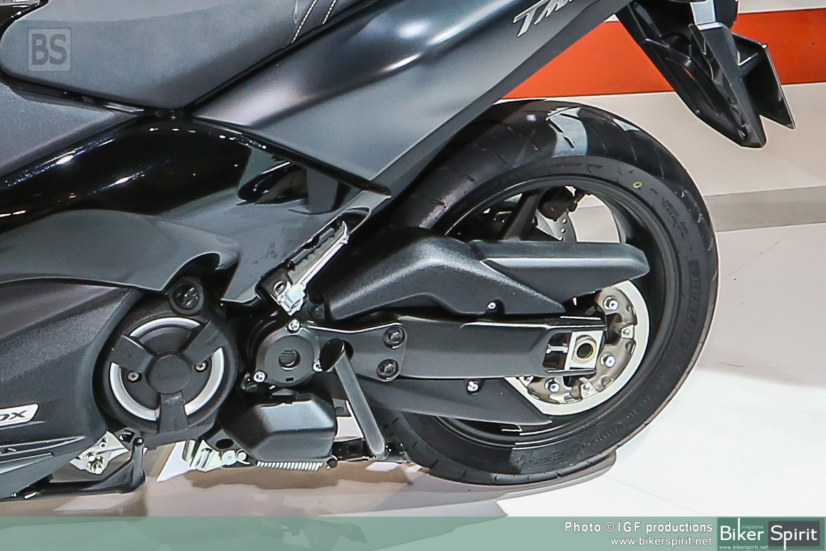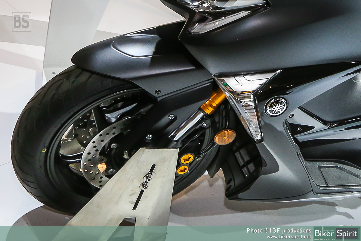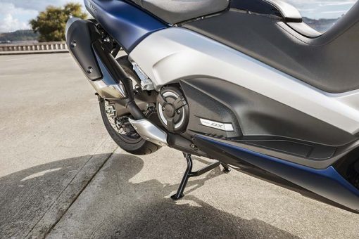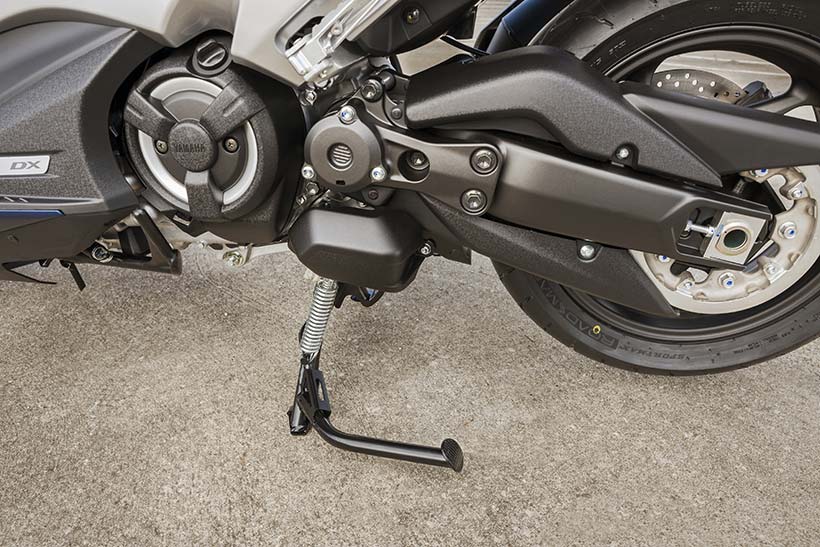 Η απόδοση χειρισμού τύπου μοτοσυκλέτας εκφράζεται μέσα από το μακρύτερο ψαλίδι, το οποίο είναι πιο εμφανές στη δεξιά πλευρά αυτής της μοτοσυκλέτας. Επίσης, η μηχανική σχεδίαση υψηλής τεχνολογίας και η αυξημένη απόδοση λειτουργίας του TMAX υπογραμμίζονται από το συγκρότημα άξονα ψαλιδιού νέας σχεδίασης και το περίβλημα με εκτεθειμένο τον κινητήρα στη δεξιά πλευρά.