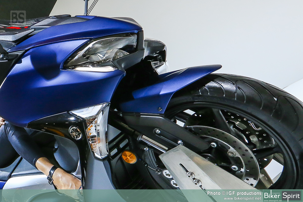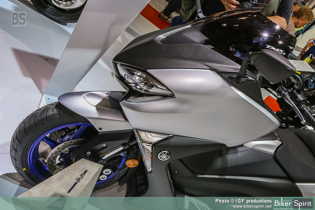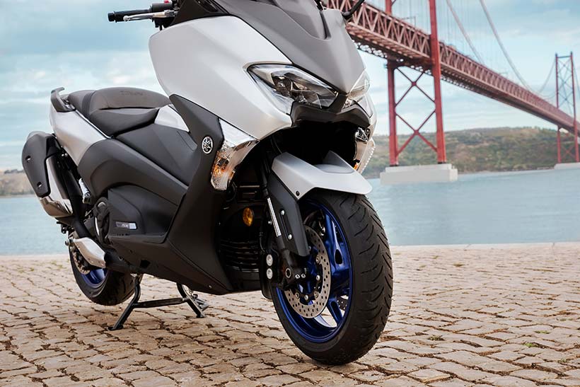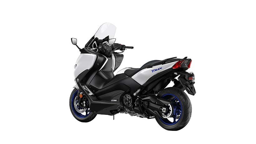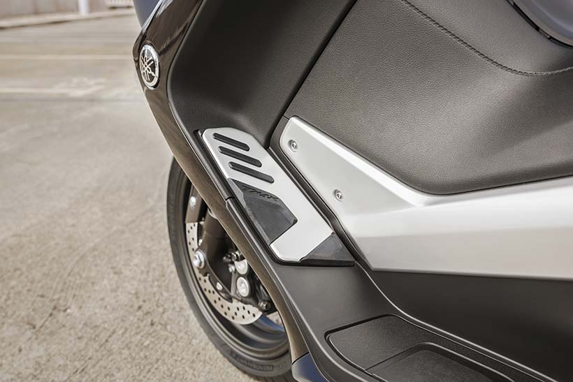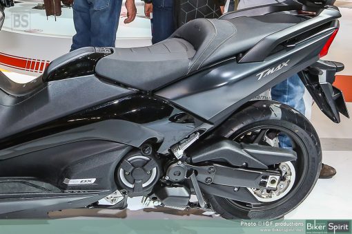Η απόδοση χειρισμού τύπου μοτοσυκλέτας εκφράζεται μέσα από το μακρύτερο ψαλίδι, το οποίο είναι πιο εμφανές στη δεξιά πλευρά αυτής της μοτοσυκλέτας. Επίσης, η μηχανική σχεδίαση υψηλής τεχνολογίας και η αυξημένη απόδοση λειτουργίας του TMAX υπογραμμίζονται από το συγκρότημα άξονα ψαλιδιού νέας σχεδίασης και το περίβλημα με εκτεθειμένο τον κινητήρα στη δεξιά πλευρά.