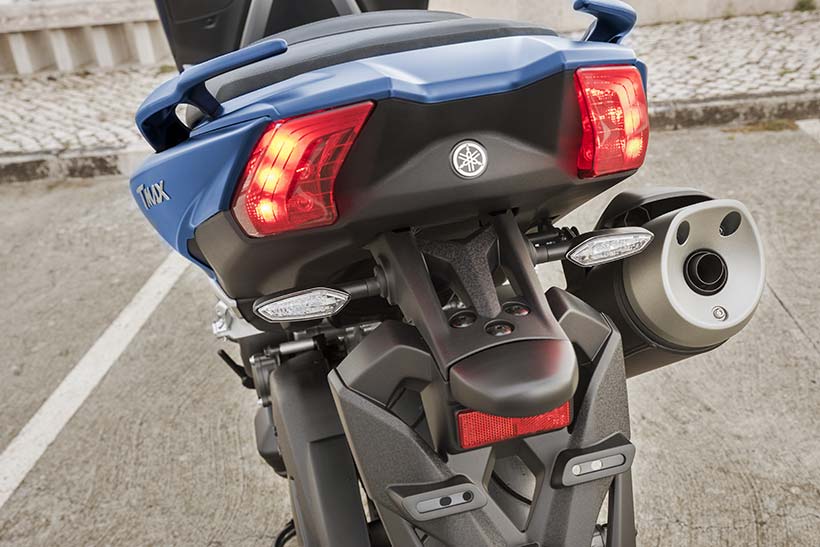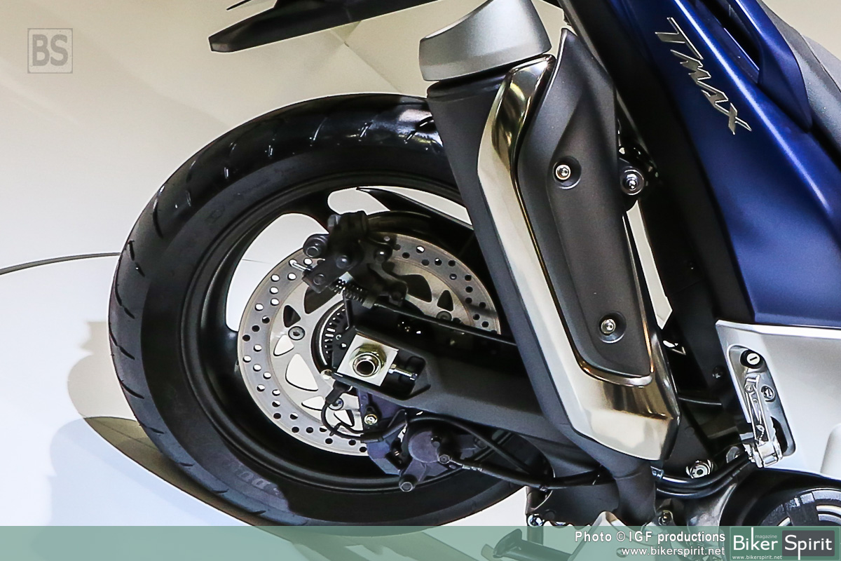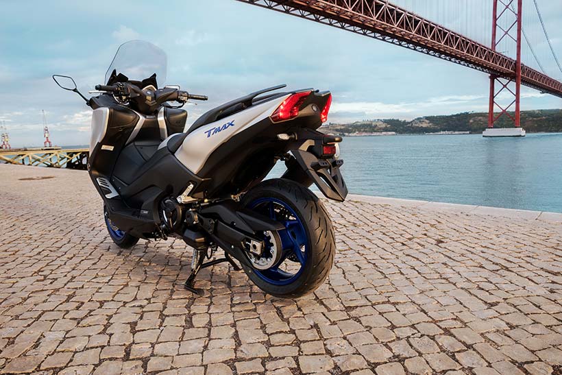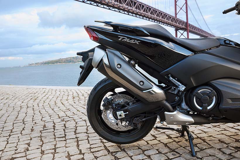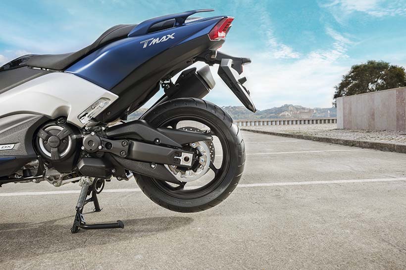 Εκτός από το σκελετό αλουμινίου νέας σχεδίασης και το μακρύτερο ψαλίδι, το TMAX επωφελείται επίσης από μια ολοκαίνουργια πίσω ανάρτηση με μοχλικό που διαθέτει οριζόντιο πίσω αμορτισέρ. Οι προοδευτικές σχέσεις μετάδοσης μοχλών του νέου συστήματος έχουν σχεδιαστεί για να παρέχουν ομαλή απόσβεση στο αρχικό στάδιο της κίνησης της ανάρτησης, με πιο σφιχτή ανάρτηση όταν το φορτίο είναι στο μέγιστο επίπεδο.