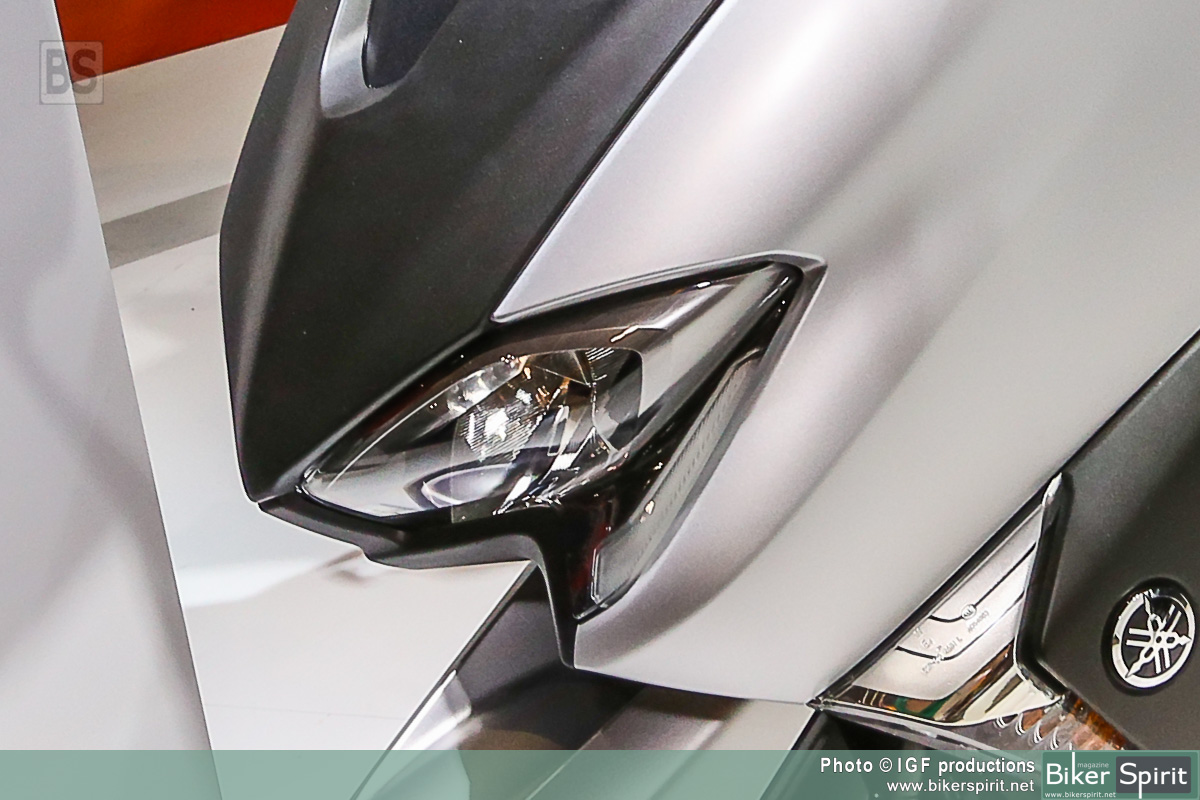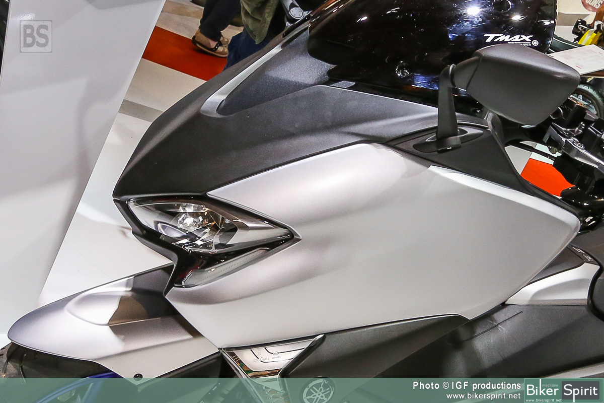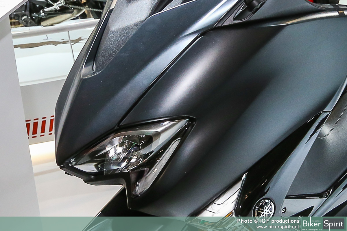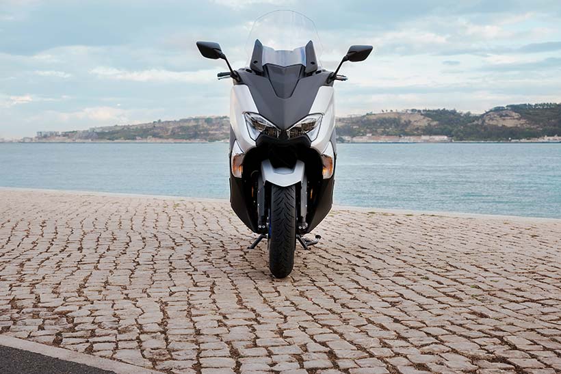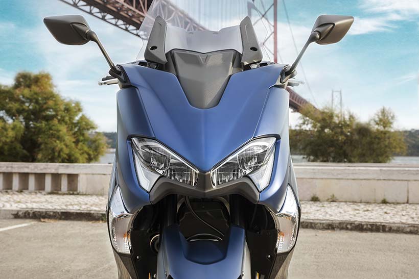 Η τελευταία έκδοση αυτού του εμβληματικού σπορ scooter διαθέτει πιο μικρή μπροστινή όψη, με επιχρωμιωμένες γραμμές να πλαισιώνουν τους φακούς, καθώς και ανάγλυφα άκρα στην περιοχή των “βλεφάρων”. Η πιο μικρή μπροστινή όψη συνδυάζει τέσσερις προβολείς LED και φώτα θέσης, χαρίζοντας στο TMAX πιο σπορ και δυναμική εμφάνιση που αντιπροσωπεύει τις αυξημένες επιδόσεις του κινητήρα υψηλότερων προδιαγραφών και του νέου, ελαφριού πλαισίου.