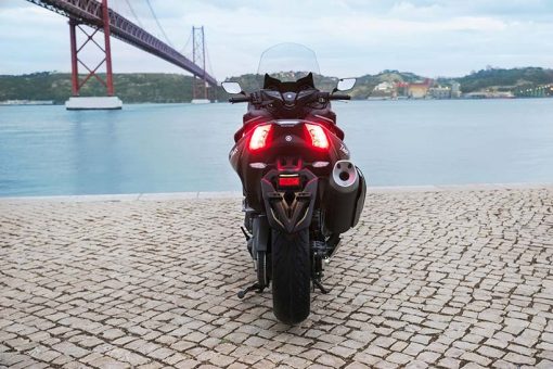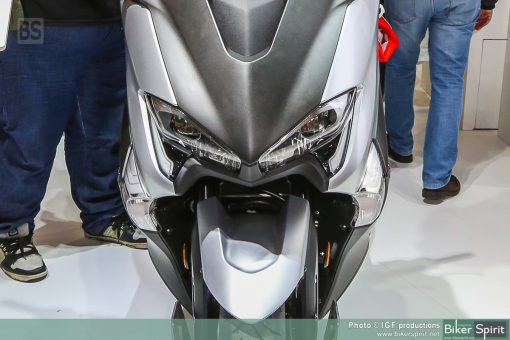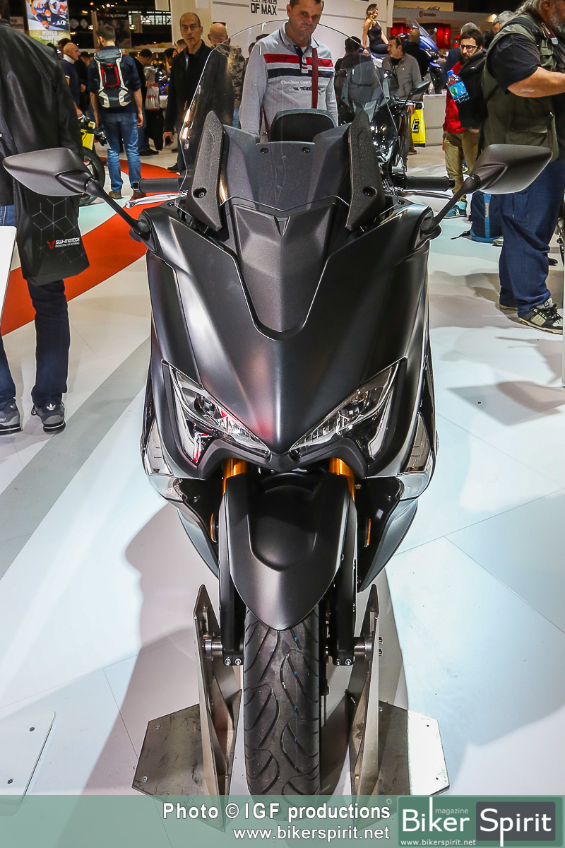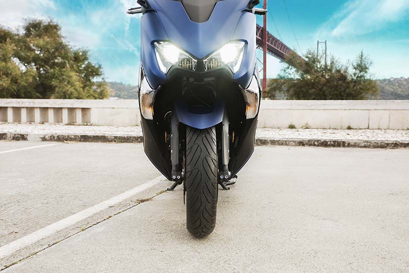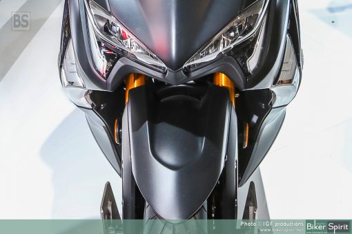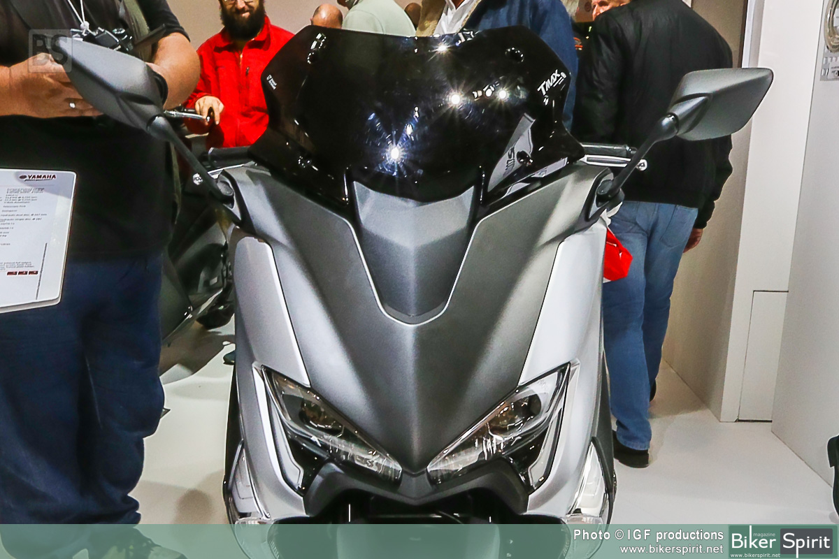 Η τελευταία έκδοση αυτού του εμβληματικού σπορ scooter διαθέτει πιο μικρή μπροστινή όψη, με επιχρωμιωμένες γραμμές να πλαισιώνουν τους φακούς, καθώς και ανάγλυφα άκρα στην περιοχή των “βλεφάρων”. Η πιο μικρή μπροστινή όψη συνδυάζει τέσσερις προβολείς LED και φώτα θέσης, χαρίζοντας στο TMAX πιο σπορ και δυναμική εμφάνιση που αντιπροσωπεύει τις αυξημένες επιδόσεις του κινητήρα υψηλότερων προδιαγραφών και του νέου, ελαφριού πλαισίου.